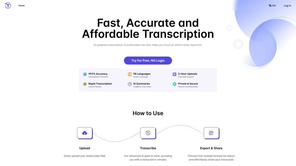 Upload audio/video files, transcribe, export and share